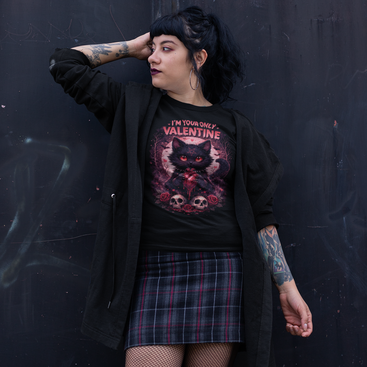 This design features a dark gothic kitten with glowing red eyes, holding a dripping heart beneath the bold words “I’m Your Only Valentine.” Surrounded by skulls, roses, and eerie Valentine vibes, it blends sweetness with obsession in the most dangerously adorable way.